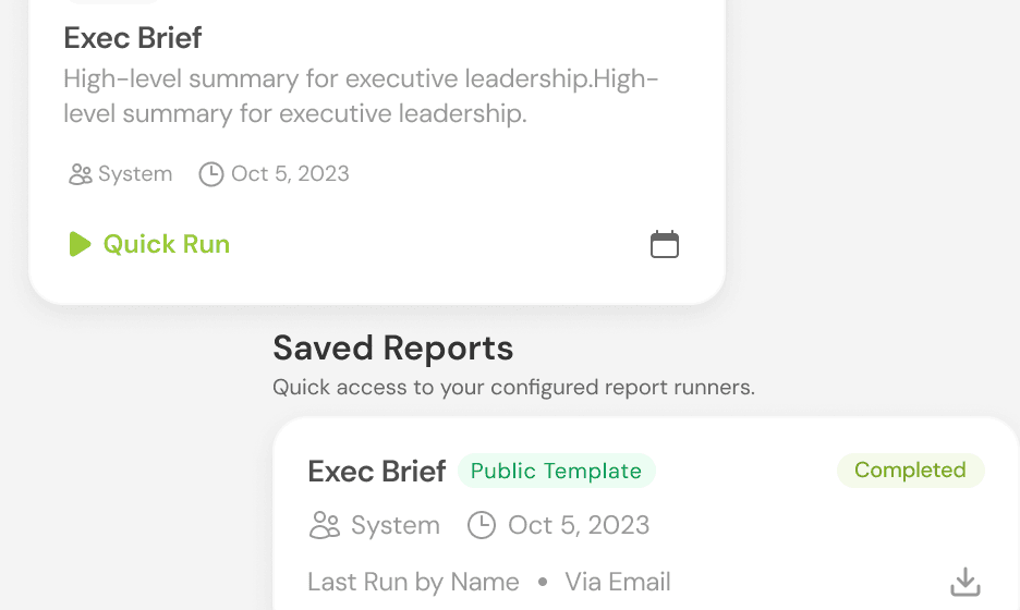 Generate briefs, health checks, and executive summaries in minutes, then share or schedule them across your team.