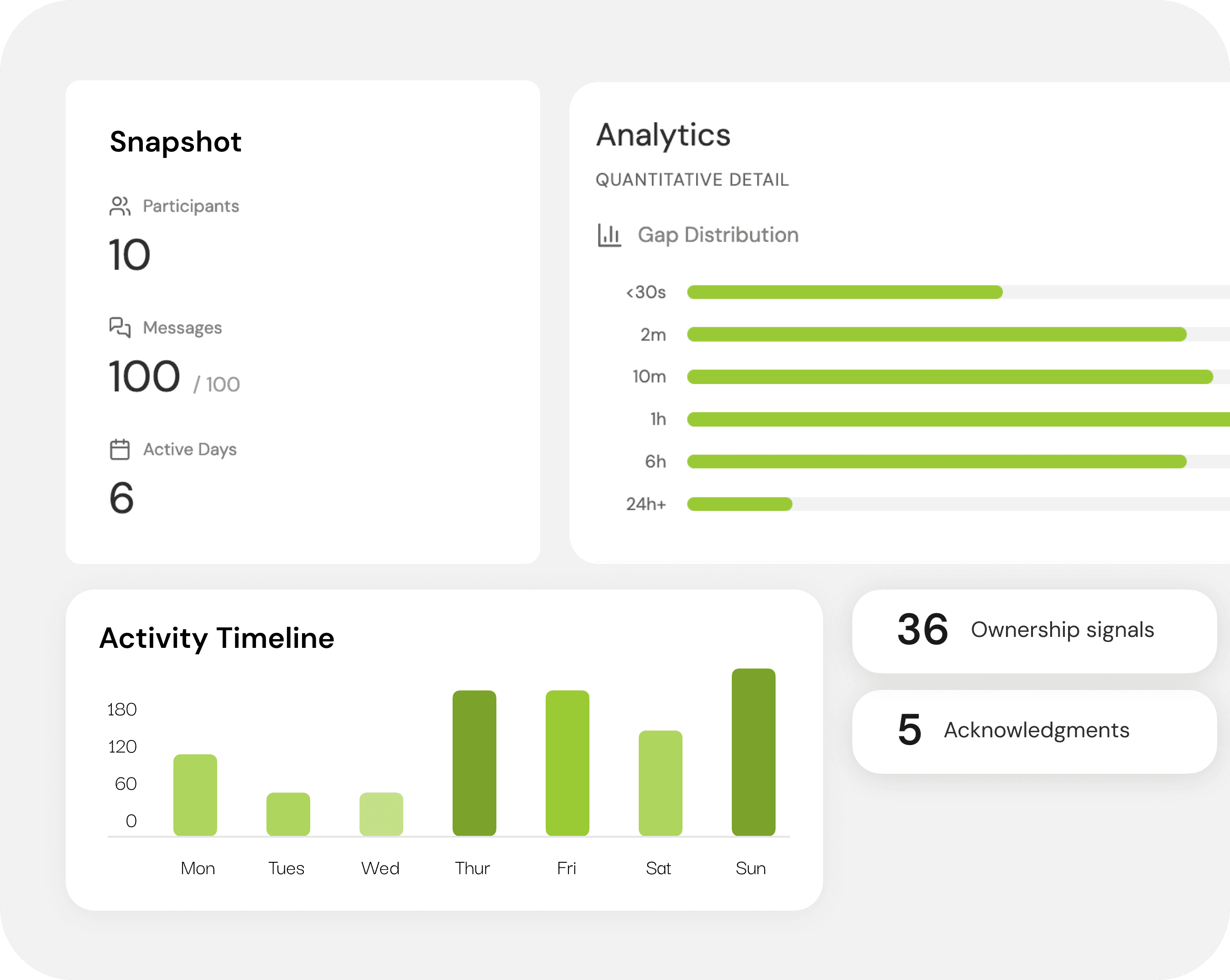 In a live demo, we run a lightweight scan on your chat export and turn it into a crisp, visual snapshot of communication health—participation, response gaps, real-time moments, and acknowledgement loops.