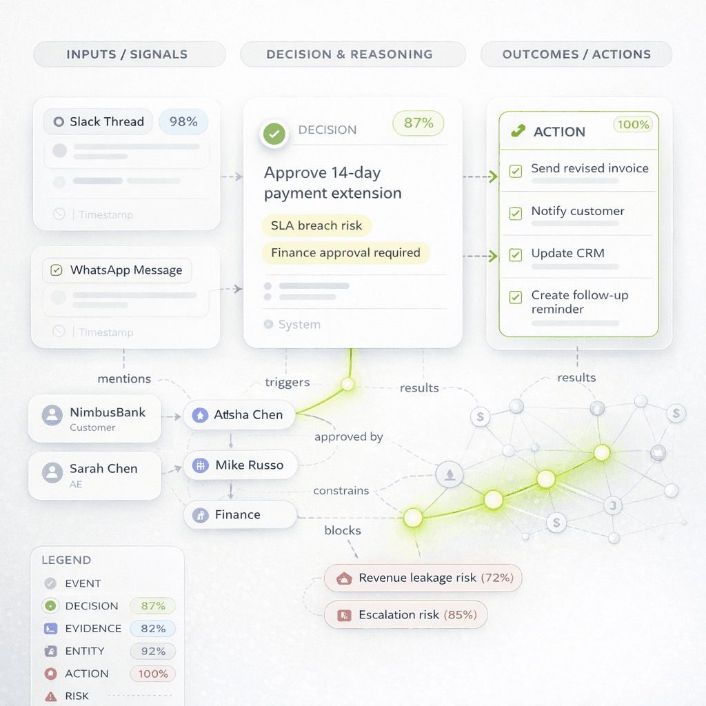 A pricing change gets approved in Slack. A product exception is discussed in email. A customer escalation is acknowledged in a meeting. A follow-up gets promised in a support thread. The information exists, but the context is scattered across channels, people, and timelines.